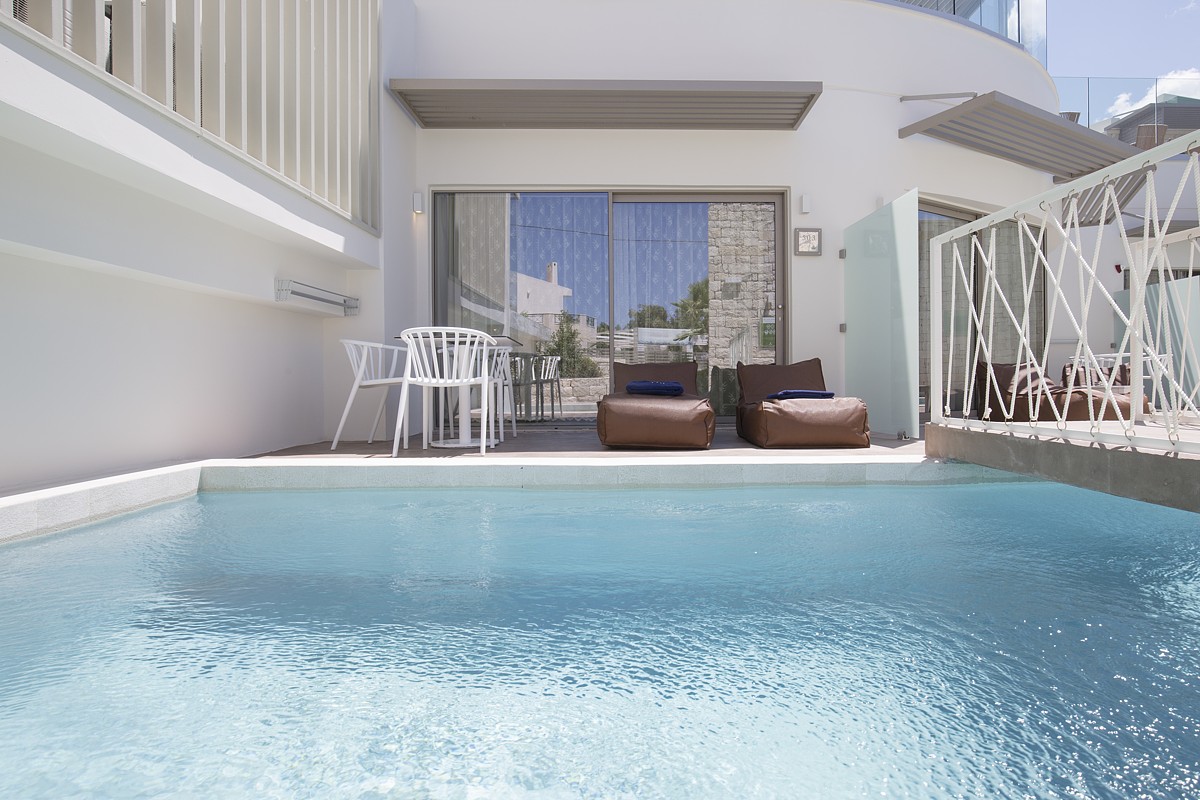 Sharing Pool Suite: kb. 26m2-es, 2-4 vendég számára foglalható, közös terasz és medence. Aki a medence mellett szeretne lustálkodni, ugyanakkor a szálloda többi vendégét elkerülni, annak tökéletes választás. Kizárólag medencére néző kilátást kínálnak, és felszereltségük megegyezik az Executive Loft lakosztályokéval. A szobák egyszintesek, de szintén félig elkülönített nappali és hálórészekkel rendelkeznek.