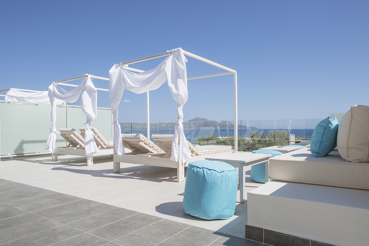 Aloe Vip Suite: kb. 36m2-es, maximum 4 vendég számára foglalható, saját erkélye tengerre néző. Lenyűgöző kilátással rendelkezik a Souda-öbölre, a szálloda legmagasabb pontjáról, a lehető legnagyobb magánélet mellett. Megközelíthető lifttel közvetlenül a recepció épületében. A különleges üdvözlőcsomag az egyik kiváltság, amelyet a lakosztály vendégei kapnak.